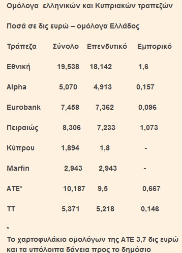 Δηλαδή μόνο το 7,1% του χαρτοφυλακίου ομολόγων των τραπεζών αποτελεί το εμπορικό χαρτοφυλάκιο. Η Εθνική με 19,538 δις ευρώ εμφανίζει όπως είναι ήδη γνωστό το μεγαλύτερο χαρτοφυλάκιο ομολόγων. Στο επενδυτικό τα 18,142 δις ευρώ και στο εμπορικό τα 1,6 δις ευρώ. Από τα 19,538 δις ευρώ με βάση τα stress tests απομειώνονται το τίτλος το δάνειο της Goldman Sachs. Πέραν από ελληνικά ομόλογα η Εθνική κατέχει 93 εκατ Βουλγαρίας, 110 εκατ Γερμανίας, 301 εκατ Ρουμανίας. Η Alpha bank κατέχει ελληνικά ομόλογα 5,070 δις ευρώ εκ των οποίων 4,913 δις ευρώ στο επενδυτικό χαρτοφυλάκιο και 157 εκατ στο εμπορικό. Πέραν αυτών κατέχει 30 εκατ κυπριακά ομόλογα, 15 εκατ Αυστρίας, 486 εκατ ευρώ Ρουμανίας. Η Eurobank κατέχει 7,458 δις ευρώ ελληνικά ομόλογα εκ των οποίων 7,362 δις ευρώ στο επενδυτικό και 96 εκατ στο εμπορικό. Επίσης κατέχει 359 εκατ ομόλογα Βουλγαρίας, 97 εκατ Κύπρου, 162 εκατ Γαλλίας, 294 εκατ Γερμανίας, 100 εκατ Ιταλίας και 27 εκατ Λιθουανίας. Η Πειραιώς κατέχει συνολικά 8,306 δις ευρώ ελληνικά ομόλογα εκ των οποίων 7,233 δις ευρώ στο επενδυτικό και 1,073 δις ευρώ στο εμπορικό. Παράλληλα κατέχει 542 εκατ ευρώ ομόλογα Ρουμανίας, εκ των οποίων 390 εκατ στο επενδυτικό και 152 εκατ ευρώ στο εμπορικό. Η ΑΤΕ κατέχει 10,187 δις ευρώ έκθεση στο δημόσιο εκ των οποίων τα 9,5 δις ευρώ είναι στο επενδυτικό χαρτοφυλάκιο και 667 εκατ ευρώ στο εμπορικό. Ωστόσο τα ομόλογα του δημοσίου είναι 3,6 δις ευρώ και 6,5 δις ευρώ είναι δάνεια που έχει χορηγήσει η ΑΤΕ στο ελληνικό κράτος. Επίσης κατέχει ομόλογα Ρουμανίας 96 εκατ ευρώ. Η τράπεζα Κύπρος κατέχει ομόλογα 871 εκατ της Κύπρου, 1,894 δις ευρώ Ελλάδος 356 εκατ Ιρλανδίας, 32 εκατ Ουγγαρίας, 59 εκατ Πολωνίας και 17 εκατ Σλοβενίας. Η Marfin Popular Bank κατέχει 2,943 δις ευρώ ελληνικά ομόλογα τα οποία βρίσκονται στο επενδυτικό χαρτοφυλάκιο. Αυστρίας 307 εκατ ευρώ, Κύπρου 314 εκατ ευρώ, 84 εκατ Ιρλανδίας. Το ΤΤ διαθέτει 5,371 εκατ ευρώ ελληνικά ομόλογα εκ των οποίων τα 5,218 δις ευρώ στο επενδυτικό και 146 εκατ ευρώ στο εμπορικό.
