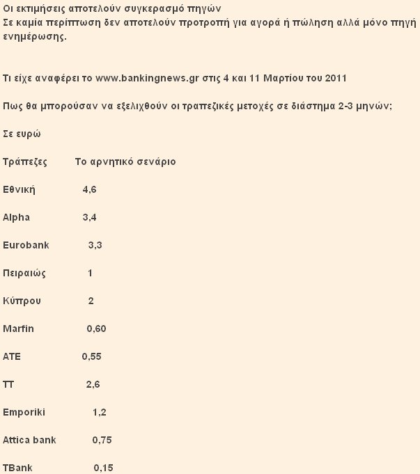 Στις 4 και 11 Μαρτίου το http://www.bankingnews.gr παρουσίασε μια σειρά εκτιμήσεων που αποτελούν συγκερασμό πηγών για την βραχυχρόνια συμπεριφορά των τραπεζικών μετοχών.